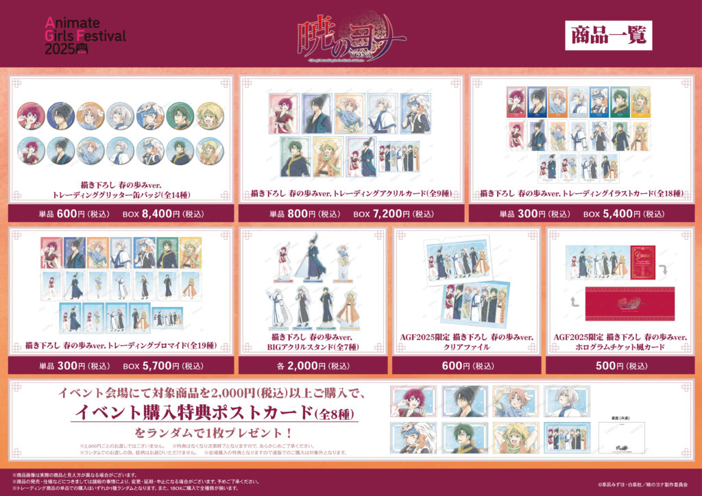今回のイベントでは、TVアニメ「暁のヨナ」より新規描き下ろしイラストを使用したグッズを多数先行販売する他、イベント購入特典の配布を予定しております。